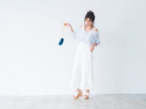 パンツ¥16,000(mimi&roger/ミミ&ロジャー)、ガウン¥12,000(Mila Owen ルミネ新宿店<me couture>)、バッグ¥19,000(ティースクエア<パオラヌッティ>)、靴¥20,000(インター ショシュール<インター ショシュール>)、ピアス¥6,200(Gas Bijoux 青山<Gas Bijoux>)、チョーカー¥2,200(アネモネ/サンポークリエイト)