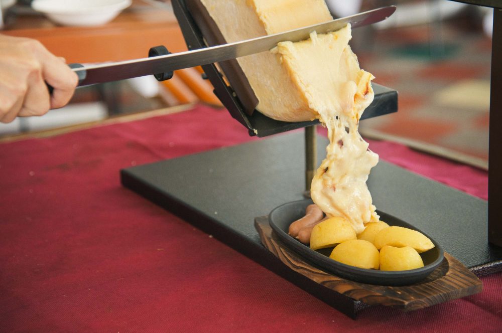 その名の通り、スイスのチーズ「ラクレット」を専用のヒーターで熱し、溶けた部分を削ってソーセージやジャガイモなどにかけて食べる料理。