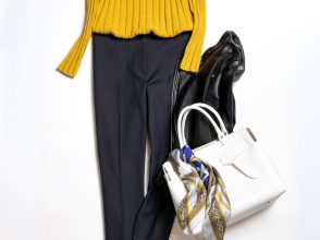 「パッと目を引くブルーのパンツが可愛い!と、ひと目で気に入ってしまったスティックパンツ。働く女性のイメージでもあったセンタープレス入りのスティックパンツは、黒や白ではなく爽やかなブルーでフレッシュな印象に。トップスはパリッとした白シャツにローゲージの白ニットを組み合わせて、リラックス感のあるきれいめコーデを目指しました。オフィスにもプライベートにも活躍しそうなカラーパンツは、新生活のワードローブにプラスしたい!