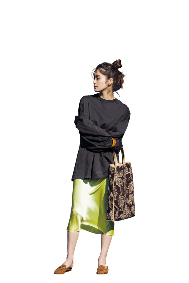 適度に薄手の素材感だから、ぶかっと着たときの落ち感がキレイ。光沢のあるスカートと合わせて、華奢な女らしさを引き立たせて。