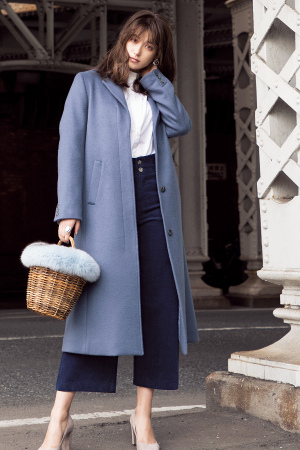 ダスティブルーのコートにネイビーのパンツを合わせた、爽やかでおしゃれっぽいグラデコーデ。マスキュリンなくすみブルーのコートは、×ネイビーのコーデュロイパンツでとことんハンサムに振るのが正解です。
