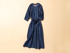 上品なポロ襟のニットワンピは、ケーブル編みや高い位置の切り替えがメリハリ見えを確約! 優しいアイボリーにゴールドのメタルビジューが効いていて、簡単コーデでもしっかり映える理想の1枚。小物も同系色でまとめてやわらかく。