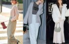 上下黒のパンツスタイルは小物の合わせ方がポイント。マイルドなベージュバッグをさりげなく取り入れるだけで、黒の印象がやわらいで女っぽく着こなせます。