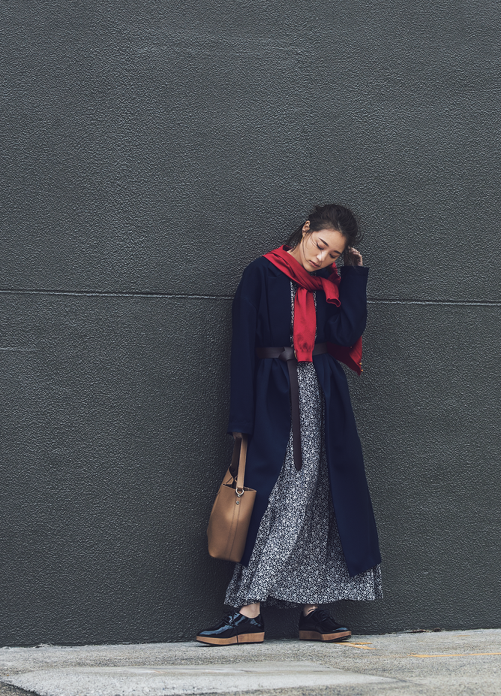 ワンピース¥9,800(チャオパニックベースヤード原宿店<CIAOPANIC>)、コート¥24,000・靴¥9,900(EMMEL REFINES ルミネ新宿店<EMMEL REFINES>)、 肩に巻いたカーディガン[スカーフ・ニット・ブラウス付き]¥23,000(アプワイザー・リッシェ<Apuweiser-riche>)、バッグ¥10,000(CONFO<DAMAIL>)、イヤリング¥20,000(アビステ)、ベルト¥2,480(ViS)