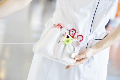 A.PHSと4色ボールペンと、身分証明のネームプレートが入っています。プレートの隅にひよこちゃんのシールがついているところは、新米ナースの印です。