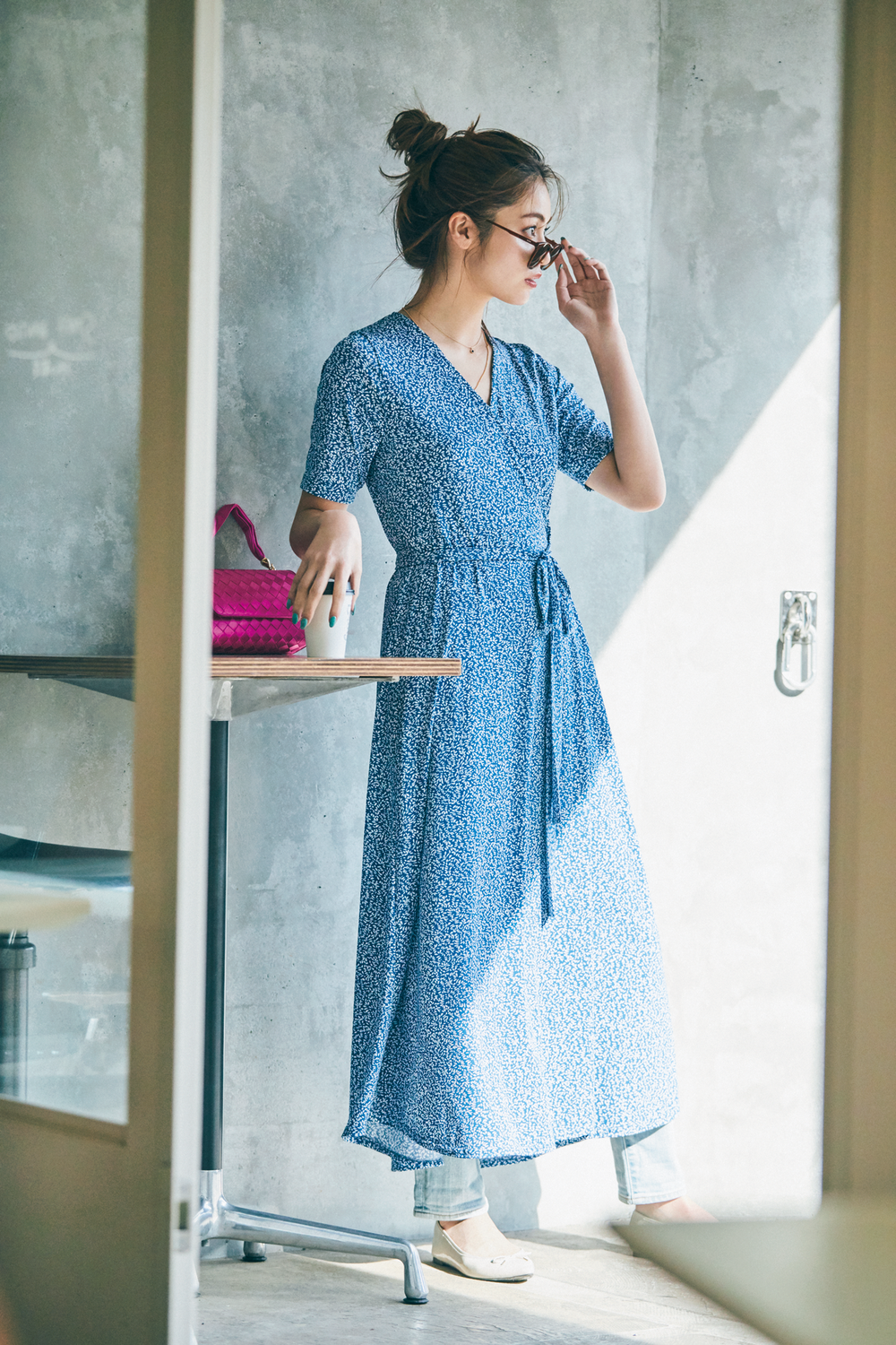 今季多いラップデザインの花柄ワンピ。 レトロで女らしいワンピースは一枚で着てもかわいいけれど、デニムとレイヤードして足元を重めにするのが今どきバランス。 デニムはワンピより淡いブルーをチョイスすれば、もったりせずに着こなせます。