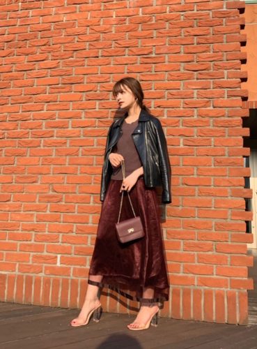 ブラウンのトップスには、シースルーのチュール付きで今回は同色系のボルドースカートを合わせました。上のノースリーブニットはこげ茶のこっくりカラーがかわいくてお気に入り。チュールは取り外し可能なのでトップスだけでも着回しています。