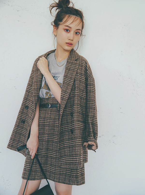 【5】ブラウンチェック柄テーラードジャケットセットアップ×グレーTシャツ