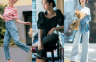 【5】ベージュトップス×デニムパンツ×グリーンパンプス