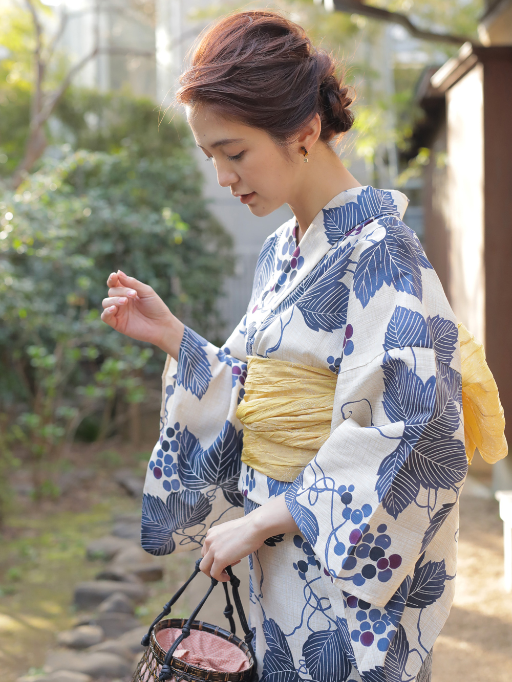 葉や蔦の柄を取り入れた、渋めな葡萄柄が大人の雰囲気。夏祭りや花火大会だけではなく、おしゃれなランチなどにもぴったり! 麻のような質感のプリントも素材を立体的に魅せてくれるので、上品で落ち着いた浴衣スタイルが楽しめます♡
