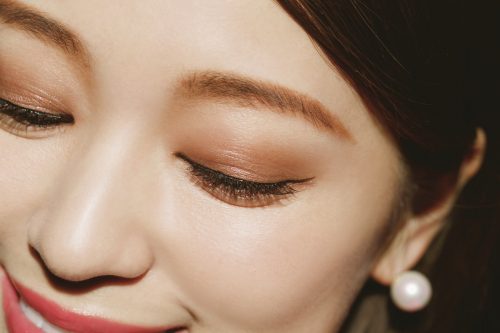 ♥をブラシに取りアイホール広めに入れ、眉の下あたりを指でなでるようにしてぼかす。下まぶたは♥をチップで目頭から目尻までのせて、目尻側はやや幅広めに。★を少し細いブラシに取り上下のまぶたのキワに入れる。
