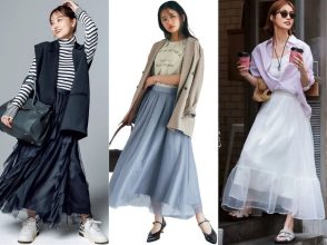 爽やかフェミニンな白スカートにカジュアルなロゴTシャツをINすれば、スニーカー合わせもすんなりマッチ。女らしさをキープした雨の日スタイルが完成します♡ 小物は、ビタミンカラーのバッグやチェック柄の折りたたみ傘を投入して雨の日コーデをトーンアップ。フットワーク抜群のスニーカーは、夏らしくて抜け感のある白がベター。爽やかで動きやすい着こなしです。