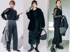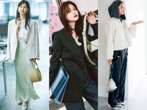 モヘア混のクロシェニットワンピにショート丈コートをプラス。ショートコートを合わせることでワンピのほのかな透け感がアピールできます。小物は黒でまとめて引き締めて。
