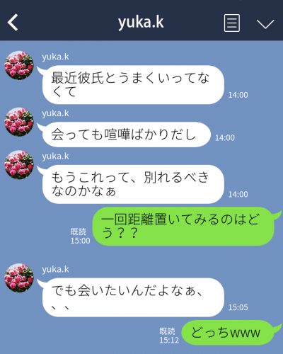 彼氏と喧嘩した友達の相談に乗っているこちらのLINE。心配だし、話を聞こうとはおもうけれど、話がまとまる様子がまるでない。話を聞いてほしいだけであって、解決させたいわけではないのかもしれませんが、相談に乗る側としては時間の無駄に感じてしまうことも(泣)。自分の中での結果は決まっているのについつい相談したくなってしまう気持ちもわかりますが、中身のないものをなんども繰り返してしまうとそれが悪影響につながることも。うーーん、その線引きが難しい!