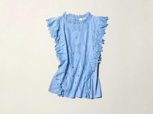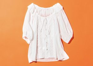 レースやカットワークなどの甘ディテールにフリルがプラスされたコットンブラウス。ロマンティックなフリルブラウスは華やかさがプラスできるので、トレンドの襟付きブラウスに抵抗あり!という人にもおすすめです。