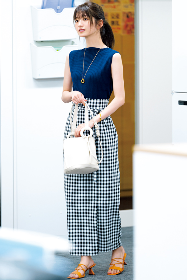ギンガムチェックのロングタイトに涼しげで女っぽい肌見せニットをすっきりIN。表情豊かなスカートのシャーリングでコーデがぱっと華やぎます。サンダルとトップスに黒を選ぶとメリハリの効いたスカートコーデが完成。今季はヒールのあるトングサンダルもトレンド。バッグはブルーで季節感&軽さを出して。