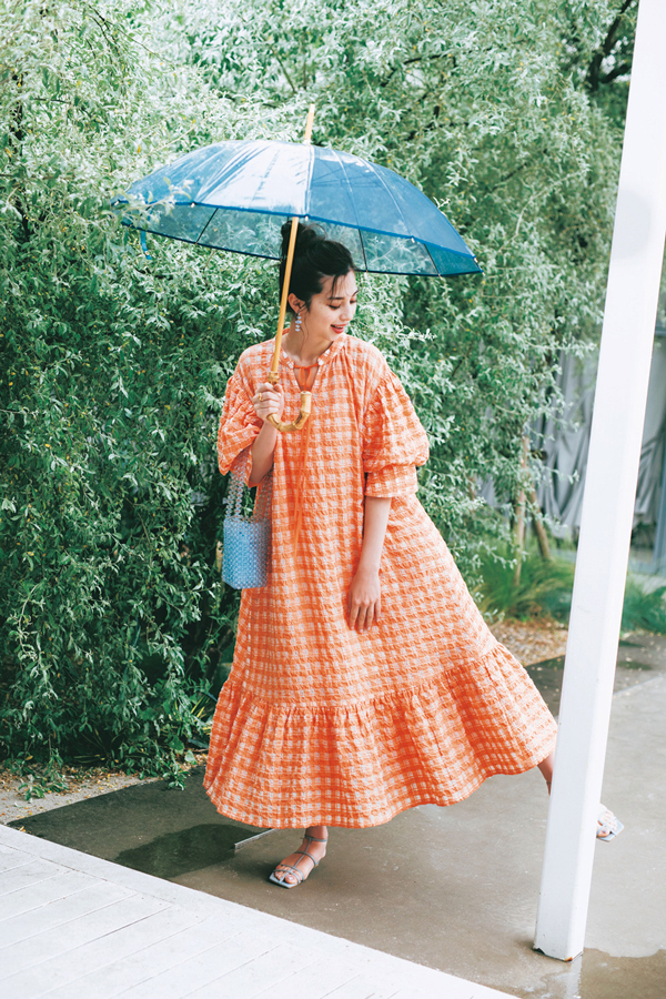 みずみずしいオレンジと水色の華やぎカラーミックスで雨の日もテンションUP。元気なオレンジに、あえて反対色の淡いブルーを差したスタイリングは大人な遊びゴコロたっぷりです。ボリューミィなワンピには、まとめヘアでバランスをとるのが◎。