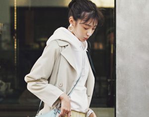 カーキのワンピースにエクリュのボアコートを無造作にON。ばさっとラフにプラスするボアコートが、今っぽいカジュアルダウンの近道に。黒コンバースでコーデ全体を締めたら、仕上げはパープルのトートバッグを加えておしゃれっぽく差し色を。