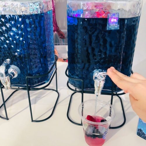 ベリーや星形のゼリーが入ったカップに、サーバーからドリンクを注ぐと……色がキレイに変化!