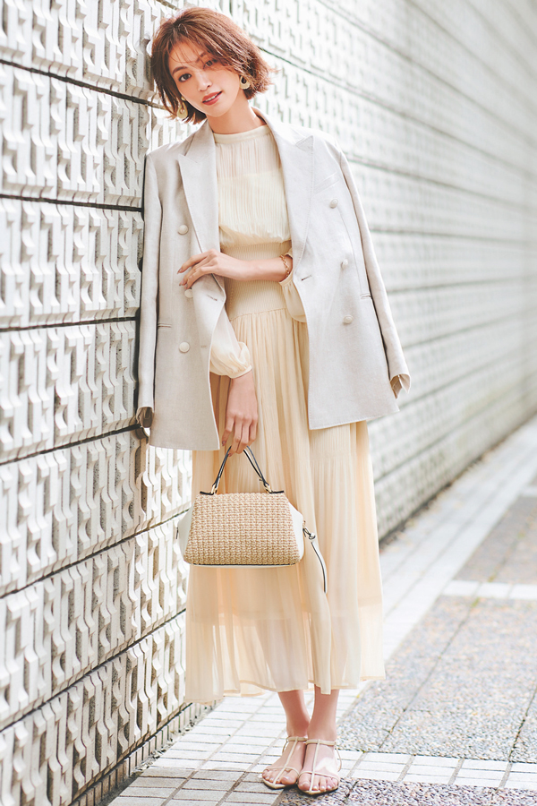 甘めワンピにジャケットを添えたきれいめスタイル♡ イエローワンピにベージュジャケット、ジュートバッグでまろやかにまとめたワントーンが上品です。シフォンやリネンの軽やかな素材に合わせて足元はヌーディにすると、コンサバすぎず抜け感が出て◎。