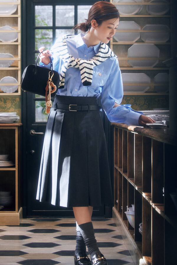 優等生なプリーツスカートにレイヤードや靴下で洒落た変化球を。ポロニットの下にシャツを重ねて、鮮度の高いトラッドスタイルが完成。女っぽさがONできるポインテッドのローファーや細ベルトでシャープなラインも演出。