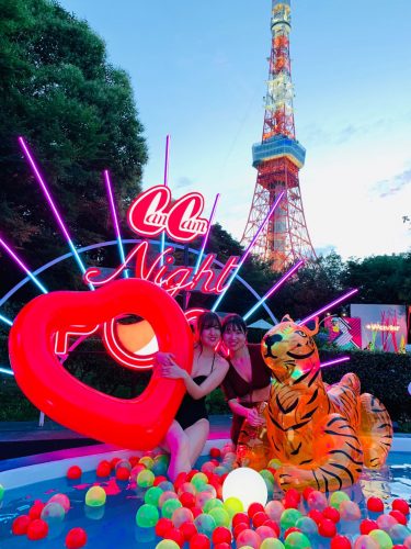 ゆめかわいいハート型フロートは、CanCamナイトプールにぴったりマッチ! ネオンサインとの相性がとにかく良いんです♡