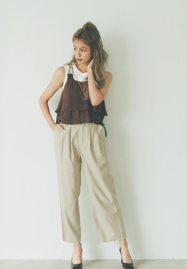 ニットタンク¥3,900(ROYAL PARTY)、パンツ¥9,800(RD Rouge Diamant/RD ルージュ ディアマン)、バッグ¥4,500(ANNAHL)、靴¥7,900(RANDA)、髪に巻いたスカーフ¥3,400(フラミンゴ原宿店)、ネックレス¥70,000(エナソルーナ神宮前本店<エナソルーナ>)、バングル¥14,000(Jouete)