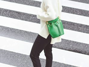 ベージュ系のジャケットにロゴTとグリーンのタックパンツをコーディネート。グッチのシグネチャーのひとつである、ダブルGのディテールが印象的なショルダーバッグで着こなし自体もクラスアップ。黒のローファーパンプスも程よいヴィンテージ感を醸してる!