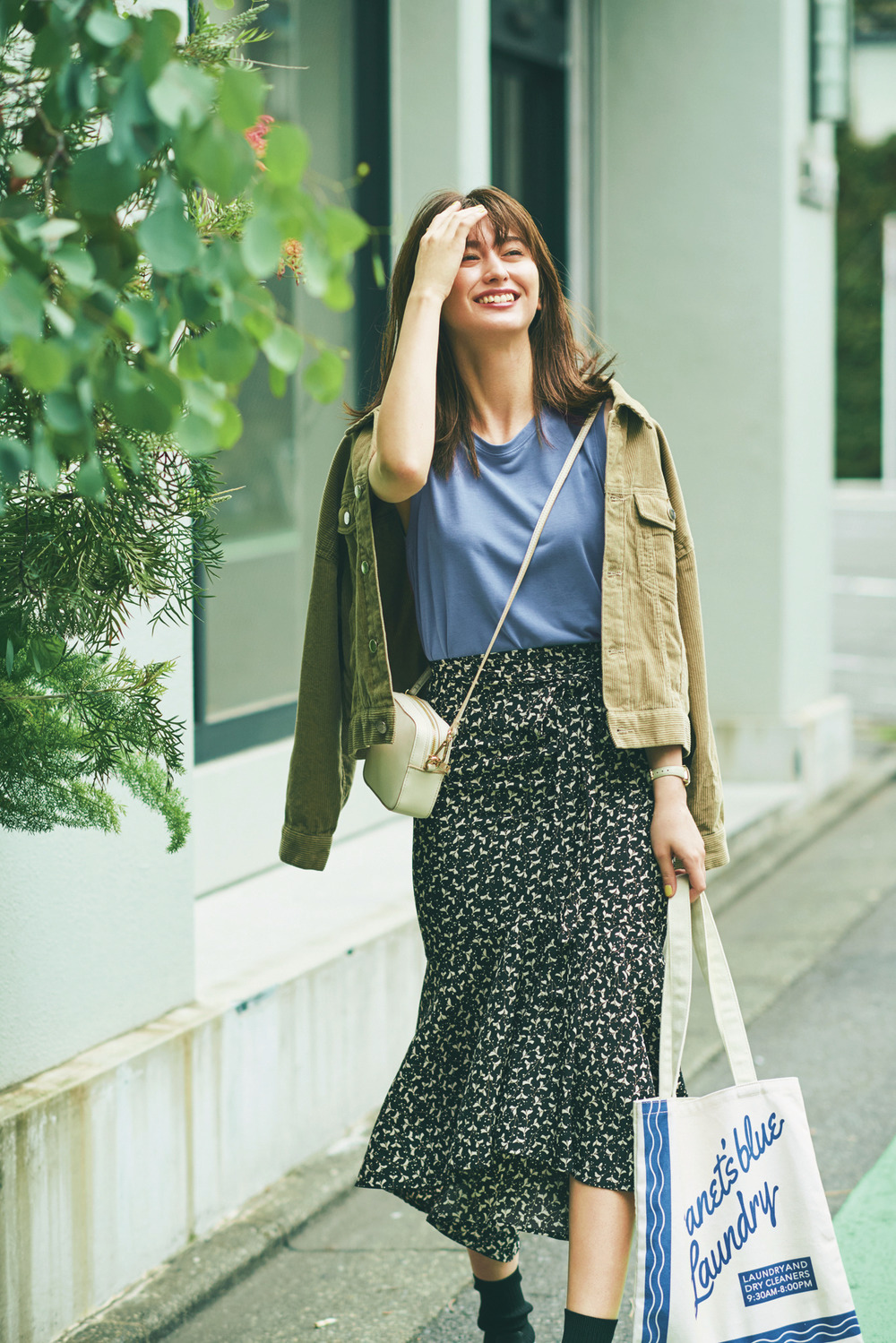 コーデュロイジャケットには、軽やかなタンクで抜け感をIN。花柄よりもこなれ見えするボタニカル柄スカートに、きれい色のブルータンクで品のよさとおしゃれ感を両立して。