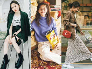 ニットとフレアスカートで作るフィット&フレアの美シルエットこそ、レディの鉄板コーディネート。歩くたびにドラマティックに揺れるスカートは、ヘム裾ならではのイレギュラーなフレア感がツボ。トップスには秋色のブラウンやネイビーではなく、顔映りのいい白ニットをチョイスするのもポイントです。小物は、靴とバッグをパープルで揃えるとワンランク上のおしゃれコーデに。さりげないけどインパクトのある差し色効果で、記憶に残る大人レディを目指しましょ。