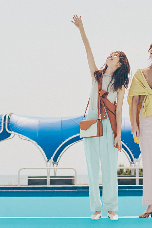ピーコックブルーの女っぽいニットキャミを、ライトベージュの麻パンツでリラクシーに着こなして。ニットキャミとパンプスをリンクさせれば、淡いベージュとのコントラストもおしゃれにきまる!
