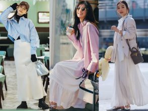 【1】水色チェスターコート×タンクトップ×白ロングスカート