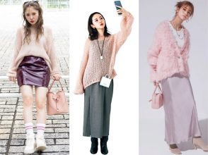【2】グレーのチェスターコート×黒ニット×ピンクミニスカート