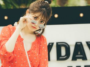 人混みの中でも目を引くバックシャントップスは、武骨なデニムでラフに着こなして。フロントはシンプルなので、茶目っ気小物でアクセントをプラス。