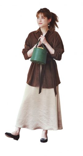 ブラウン〜ベージュのワントーンで、女性らしさとおしゃれ感を両立。ベーシックな黒とビジュー付きのぺたんこ靴なら、エレガントなルックスをキープできるので重宝します。手抜き感がない&楽ちんなのにかわいく見えるのがうれしいです♡