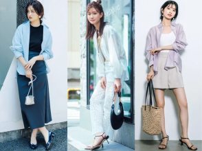トレンド感の強いシアー素材のアウターは、品よく着られて肌馴染みのいいベージュがおすすめ。インナーに黒のキャミを仕込んで、大人っぽい透け感も忘れずに。濃紺デニムやエクリュの華奢サンダルを合わせて、カジュアルでもキレイ見えは死守しましょ。