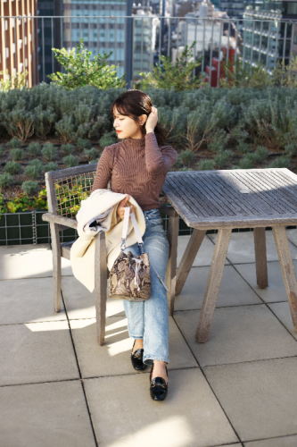 靴はこの連載で何度も登場しているPRADAのローファーです。淡色のデニムなので締め色として投入しました。