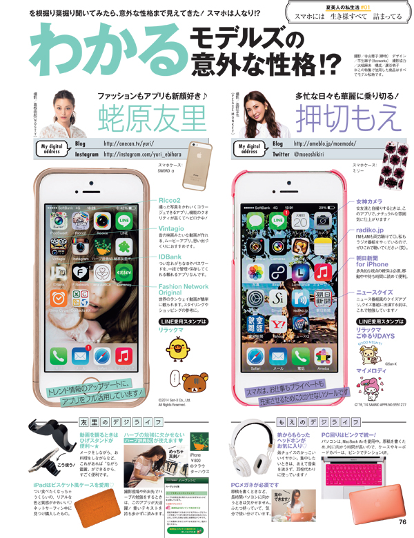 AneCanモデルの皆さん4人のスマホの中身を見ただけで、性格がわかってしまいそうになるほど、かなり個性が出ていますよね。しかも皆さん、BlogやTwitter、Instagramなどのアカウントもお持ちで、快適なSNS生活を送るために欠かせないアプリも多いようです。それぞれのSNSのリンクも貼っておいたので、愛用アプリでどんな写真を投稿しているか、ぜひ一度のぞいてみては?(さとうのりこ)