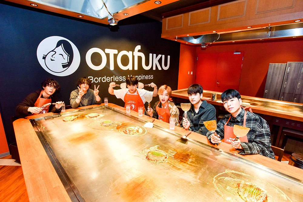 その後は広島駅前にある「OKOSTA」で広島焼き作りを体験。大きな鉄板を前にメンバーもワクワクしている様子。帽子とエプロンをつけ、広島焼き作りが一番上手な人を決める対決がスタート。先生に教えてもらいながら軽快なトークと共に、調理が進んでいきます。