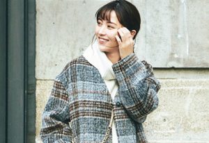 ミドル丈Pコートとミニスカートのセットアップ。トレンドのPコートは、体がすぽっと包まれるオーバーサイズや大きめの襟も女のコらしくておすすめです。オフ白のタートルを仕込んで顔映り良くまとめたら、ブラウンのキャスケットでおしゃれに引き締め。