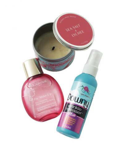 上/〝アーバンアウトフィッターズ〟で買った持ち運びOKなキャンドル。毎日違うホテルに泊まっても、同じ香りに包まれて眠れ自分空間に即チェンジ! 左/メイクをフィックスしてくれる〝クラランス〟のアフターメイクアップミスト。ローズの香りで癒やされる神コスメです♡ 右/旅先ではほぼ外食。気になるニオイに〝ダウニー〟の衣類スプレー。