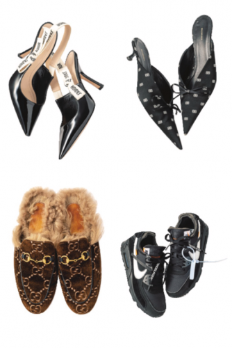 右上/〝Dior〟のキレイめパンプスは、ディナーへ行くとき用に♡ 左上/街歩き用のミュールは〝BALENCIAGA〟。右下/〝Off-White〟と〝NIKE〟のコラボスニーカーで、よく歩くレジャースポットへ。左下/行き帰りの飛行機は〝GUCCI〟のファーサンダルでノンストレスに。
