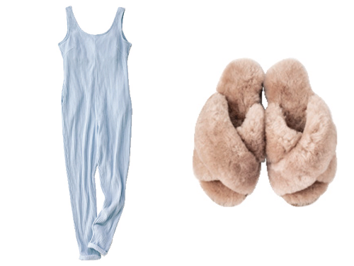 左/ホテルでリラックスできるよう、〝Priv. Spoons Club〟のカップ付きの部屋着も♡ 右/〝EMU〟のファーサンダルは履き心地がよくて◎。