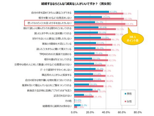 結婚するのなら、パートナーを裏切らない「誠実なひと」が良いですよね。それは男性でも女性でも同じ。ですが「誠実さ」を一言で表せないように、男女でどんな誠実さを求めているのかも変わってきます。