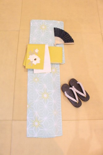 ゆかた¥32,400、帯¥21,600、下駄¥14,040、扇子¥2,808
