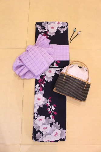浴衣¥35,640、帯¥19,440、三分紐¥5,400、帯留め¥8,640、かごバッグ¥19,440