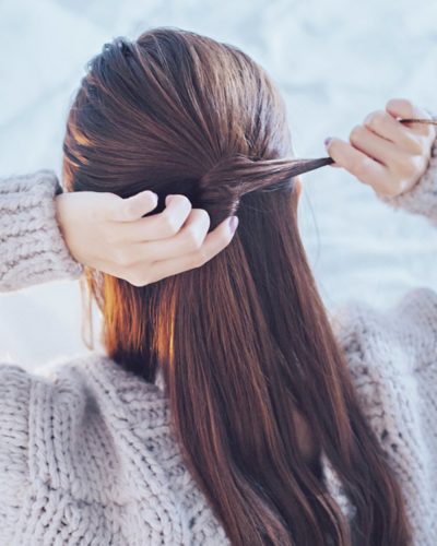 前髪を薄めに残し、耳から上の髪はハーフアップにする。前から後ろに向けて斜めのラインで取るのがコツ。