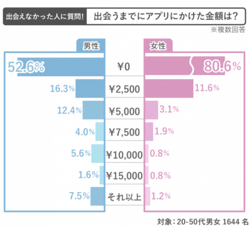 残念ながら出会えなかった人にも、質問してみました。アプリにかけた金額を聞いてみたところ、出会えなかった人は、男女ともに無課金の人が多いという結果に!男女別にみると、男性で出会えた人の86.4%はアプリない課金をしていました!いっぽう、女性は出会えた人も出会えなかった人も無課金が1位でした。アプリ内で男性が女性にメッセージを送るのにお金がかかるケースが主流ですが、女性は無料でメッセージを送れるアプリが多いことが男女差がついている原因のよう。女性は実際に会うまでにたくさんメッセージを交換して相手を知りたいという人が多数派なので、メッセージを重ねるために課金することで、実際に出会える確率が上がるようです♪