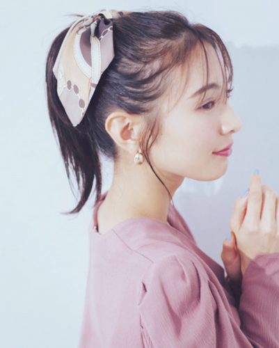 ふんわりしたポニテもキュートだけど、毛先に濡れ感のあるハイポニーなら大人かわいい雰囲気に! 薄く束にした前髪を組み合わせ、今っぽく軽やかにまとめて。