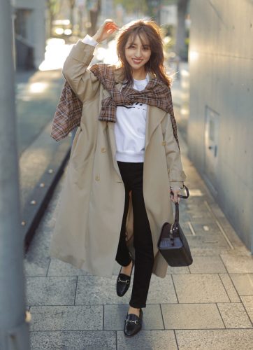 コート¥18,000(Lily Brown ルミネエスト新宿店<Lily Brown>)、スエット¥28,000(アーク インク<ザ・ニューハウス>)、パンツ¥18,000(カイタックインターナショナル<ヤヌーク>)、肩に巻いたシャツ¥6,990(エヴリス 新宿ルミネエスト店<エヴリス>)、バッグ¥26,000・靴¥13,500(ダイアナ銀座本店<ダイアナ>)